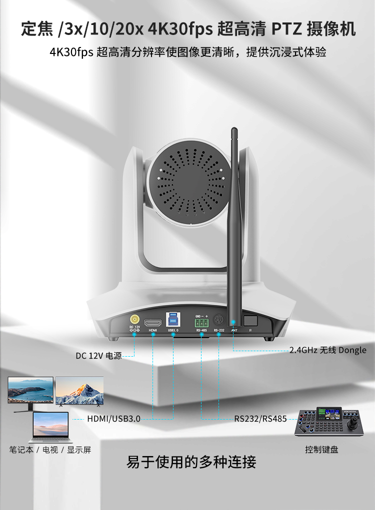 外置WIFI USB3.0 dongle,HW40系列支持最高4K30fps超清畫質,最遠傳輸距離可達30米(無遮擋)。